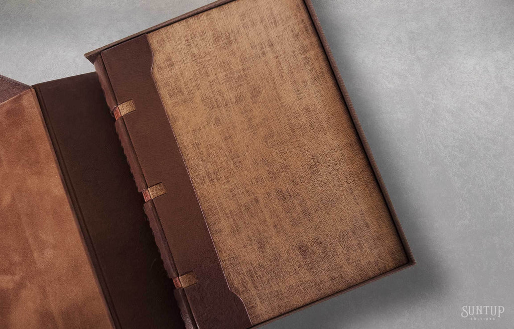 - Spine and part of the boards covered in a smooth, traditionally tanned goatskin, while the remainder of the panels feature a custom goat nubuck made specifically for this edition and which is brushed in two directions with a metal brush to achieve a distinctive surface texture.