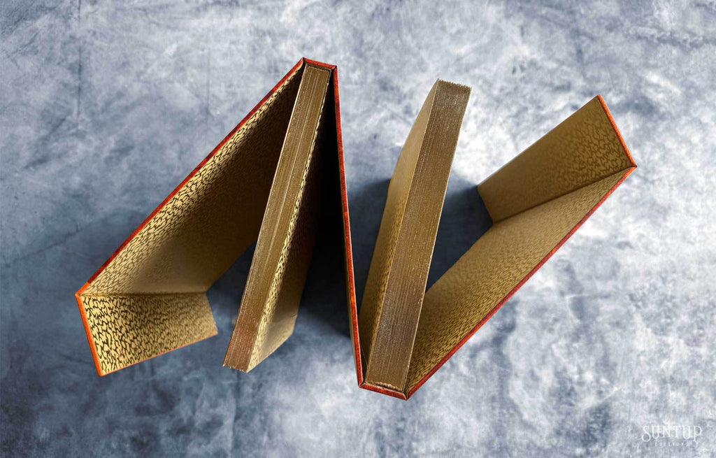 - Dos-à-dos binding, hand bound by Ben Ebel features a one-piece S-shaped cover complete with magnetic flaps covered in buffalo leather on each side.