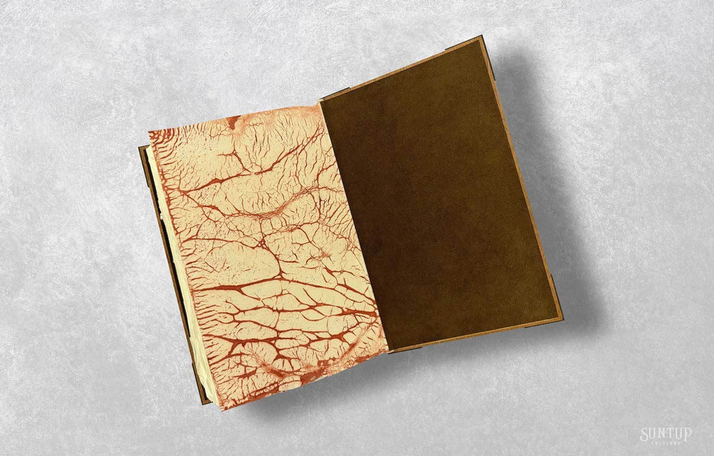 - Spine is covered in undyed veiny calf parchment, while the boards are clad in dark red, highly figured parchment that retains the natural markings of processing—an intentional nod to the visceral and unsettling tone of the text.
