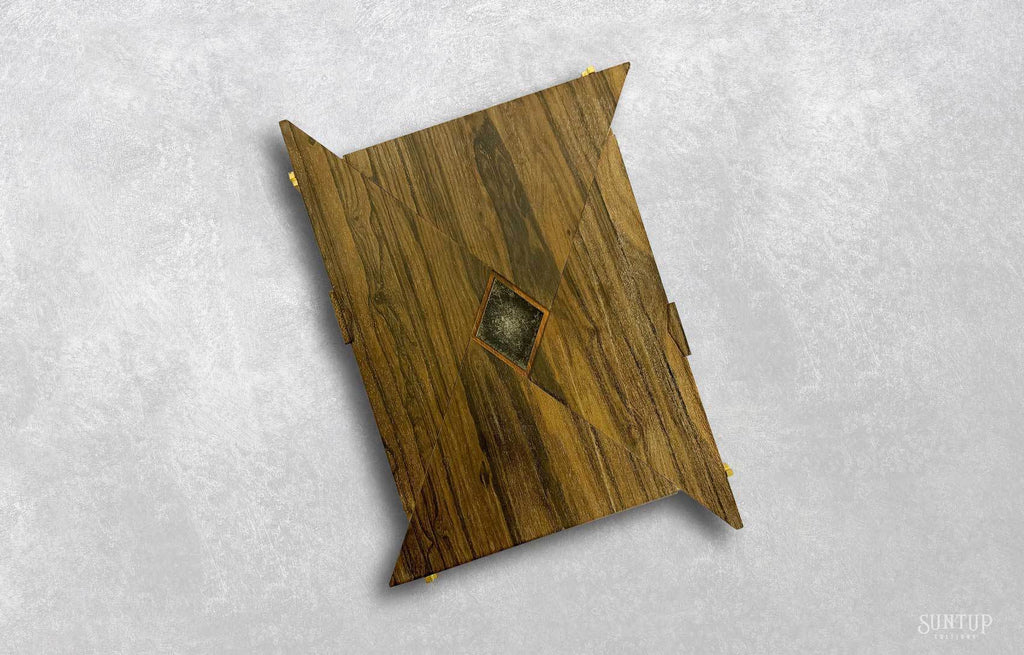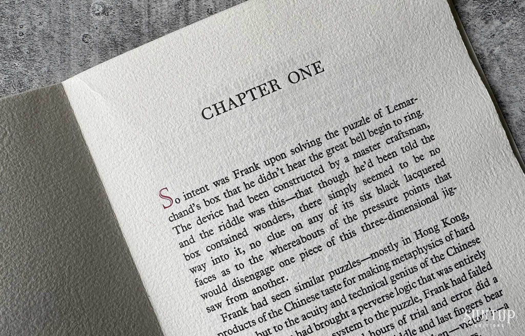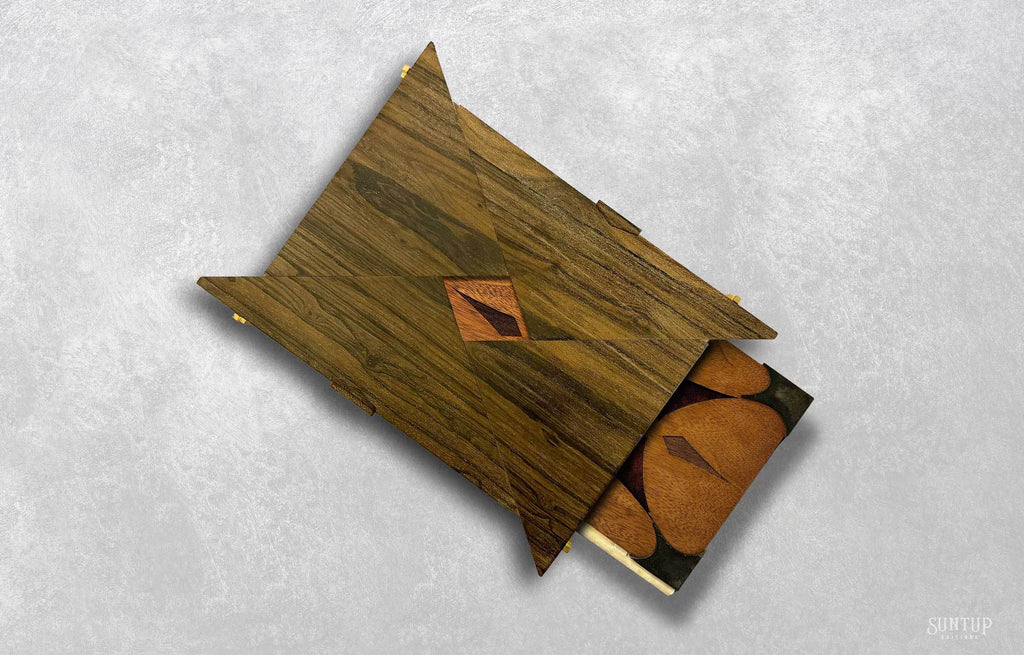 - Housed n a bespoke wooden box, inspired by the craft of traditional Japanese wooden puzzle boxes. Constructed from black walnut, ziricote, and maple, the box features sliding and shifting panels that must be manipulated in the correct sequence to unlock and reveal the book within. Brass corner fittings accent the structure, and a concealed surprise awaits when the final move is made. This intricate, interactive enclosure serves as a tangible homage to Lemarchand’s box, embodying the allure and danger of solving a puzzle whose solution opens the door to another world.