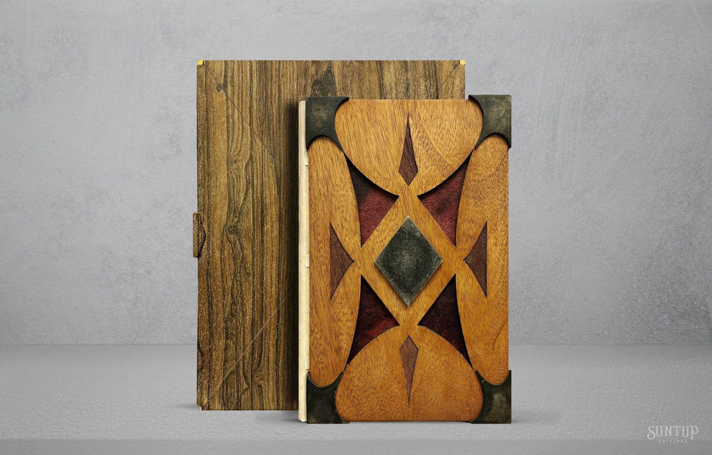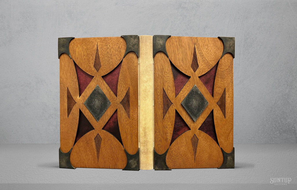 - Bradel-style binding with Gothic-inspired wooden boards and custom metal corner furniture.