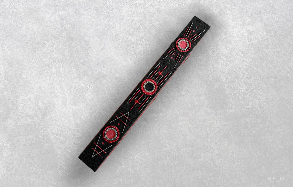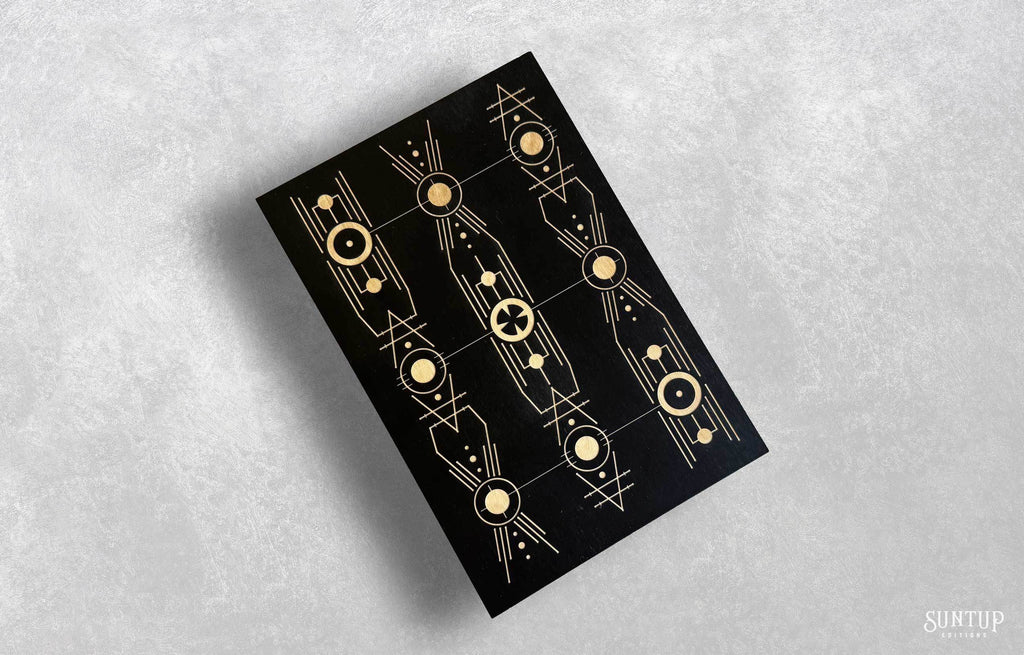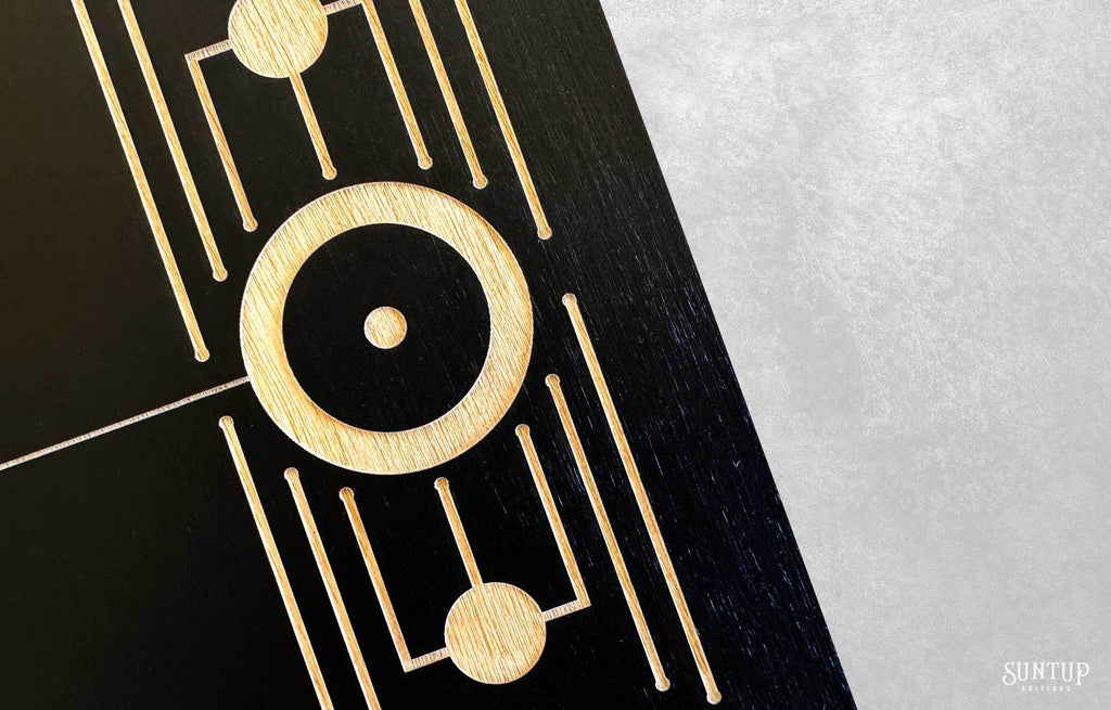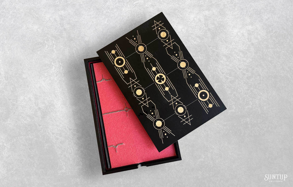 - Housed in a custom drop-top box crafted from Baltic birch wood, painted black and laser engraved using a “negative” technique in which the paint is etched away to reveal the natural wood beneath. The spine of the box is also engraved, featuring the title and author. The lid is precisely fitted to remain secure when shelved, and the interior is lined with red felt to protect the volume within.