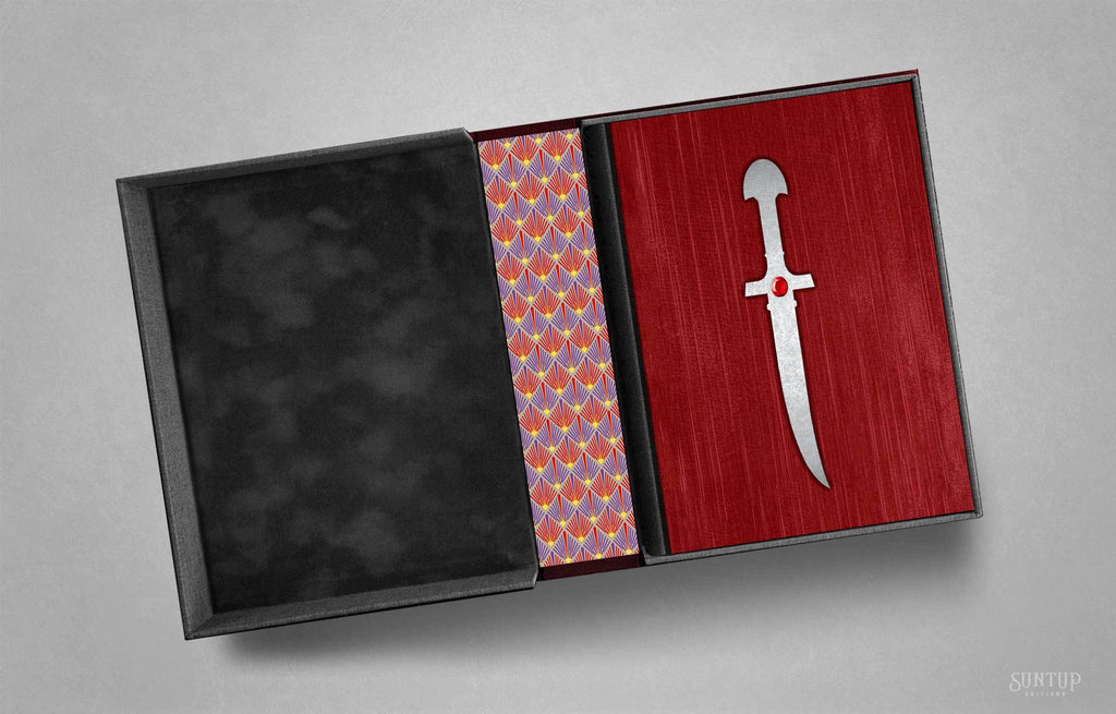 - Front cover showcases a die-cut dagger, crafted from metallic paper and inset with a ruby-red gemstone.